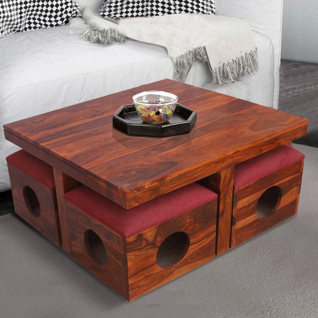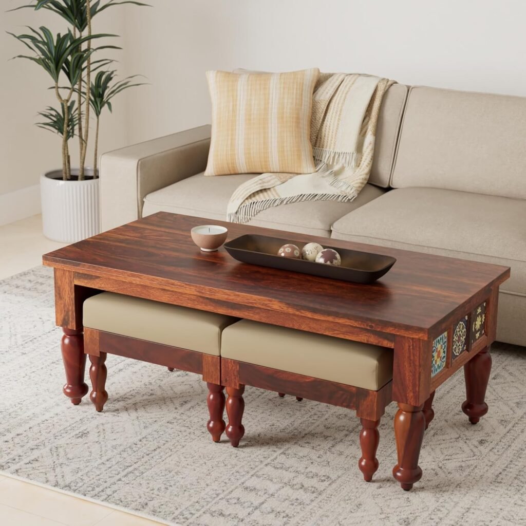 Coffee Table for Living Room, Centre Table with Drawer & Shelf Storage, Sheesham Wood, Natural Brown