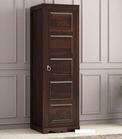 Wardrobe for Clothes | Solid Sheesham Wood Wardrobe for Bedroom | Single Door Almirah with Elephant Carving | Wooden Storage Cabinet | Walnut Finish