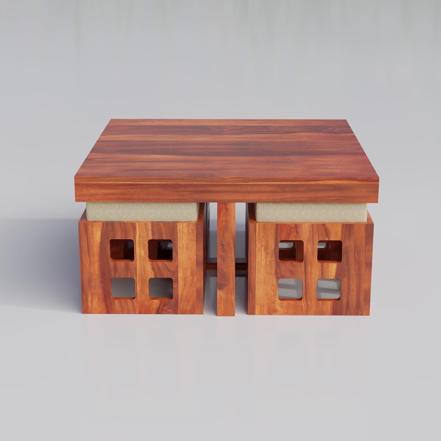 - WOODIO Solid Sheesham Wood Coffee Table With 4 Stool | Square Centre Table With Stool | Center Table With 4 Stools For Living Room | Patio Table With 4 Puffy For Home | Hotel Lounge Table | Rosewood, Dark Walnut Finish, Pre Assembled & Ready To Use
