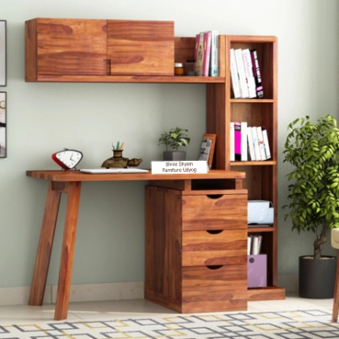 The COMPUTER TABLE & BOOK SELF from Woodio is designed to meet the needs of modern workspaces. Featuring a wide tabletop and integrated drawer storage, this table provides the perfect balance of functionality and style.