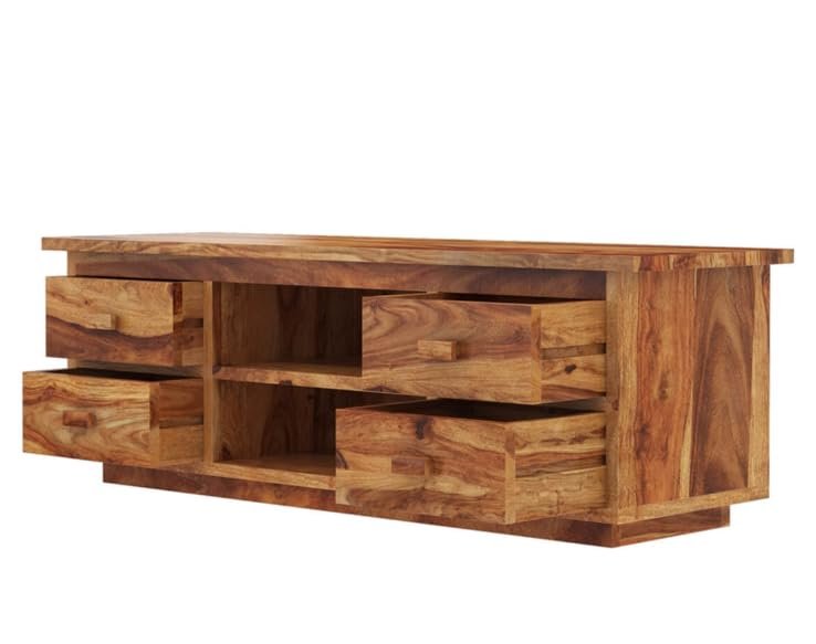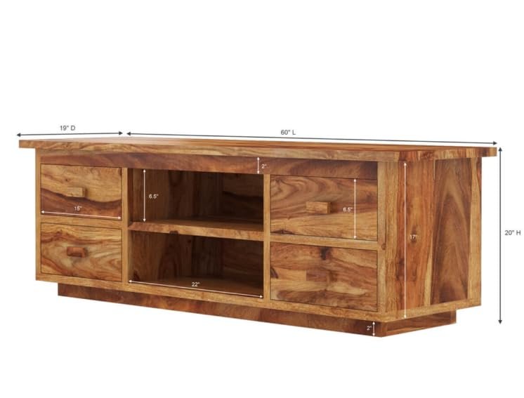 TV Cabinet for Living Room | Solid Wood TV Unit with Storage Shelves, Natural Sheesham Finish, 60”X18”X20”, 4 Drawers with Open Shelves, Media Console Cabine