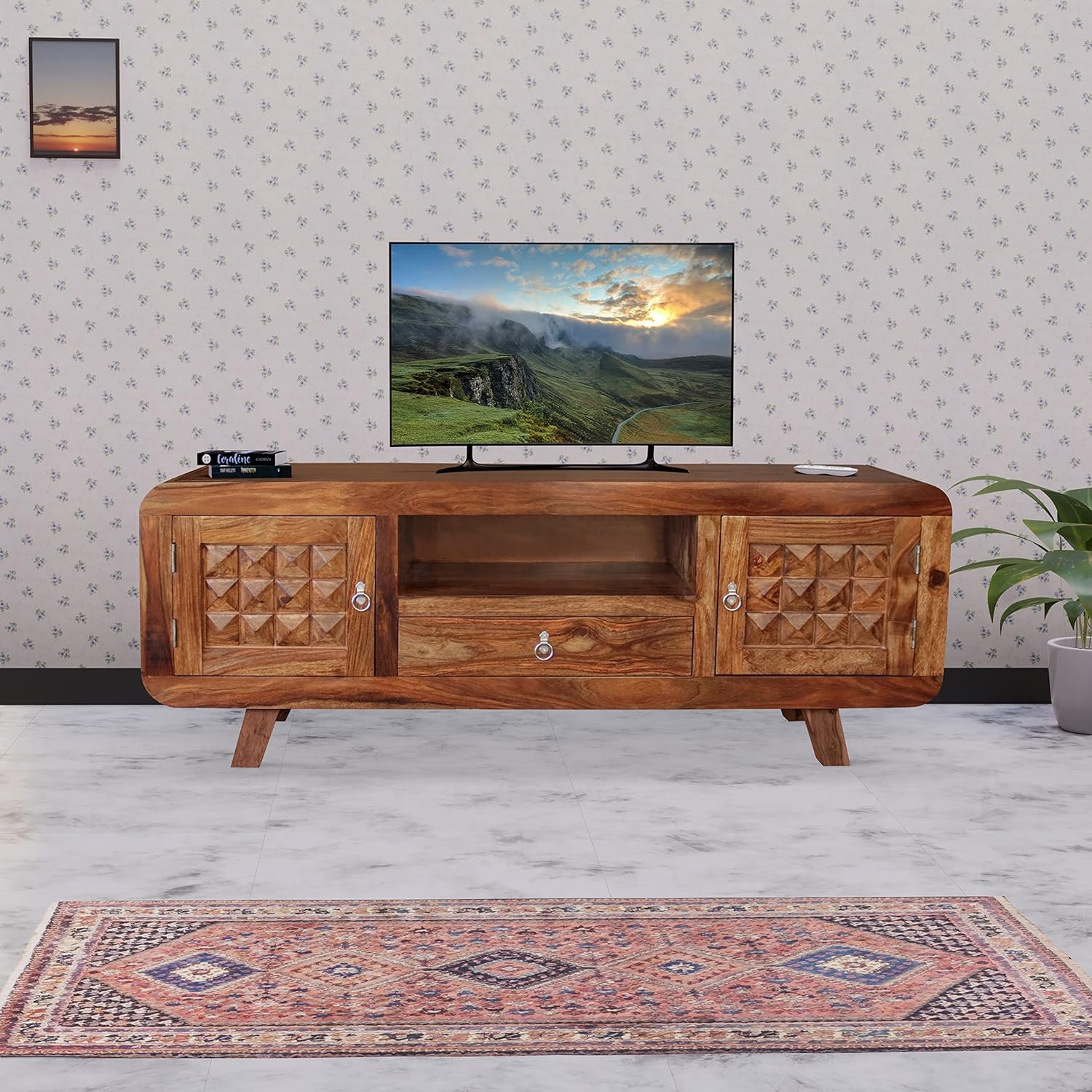 Modern TV cabinet in Newar design with spacious storage, crafted for style, strength, and organized living spaces.